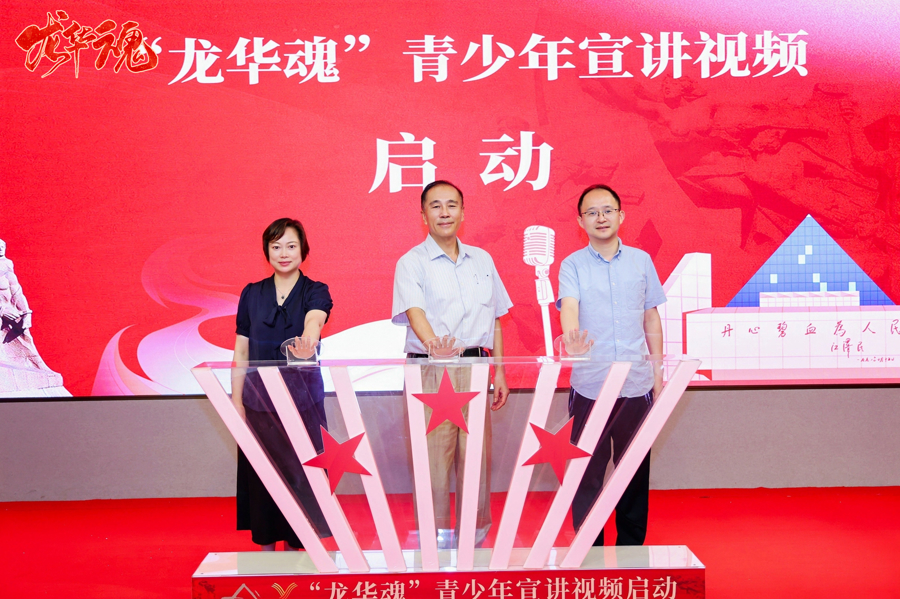 获奖青少年代表从革命烈士俞秀松之子俞敏手中接过了“龙华魂·龙传人”红领巾宣讲团队旗,上海市中共党史学会会长忻平、上海市青少年活动中心主任徐速、上海市龙华烈士陵园副馆长朱晓丽共同启动了“龙华魂”青少年宣讲视频拍摄。