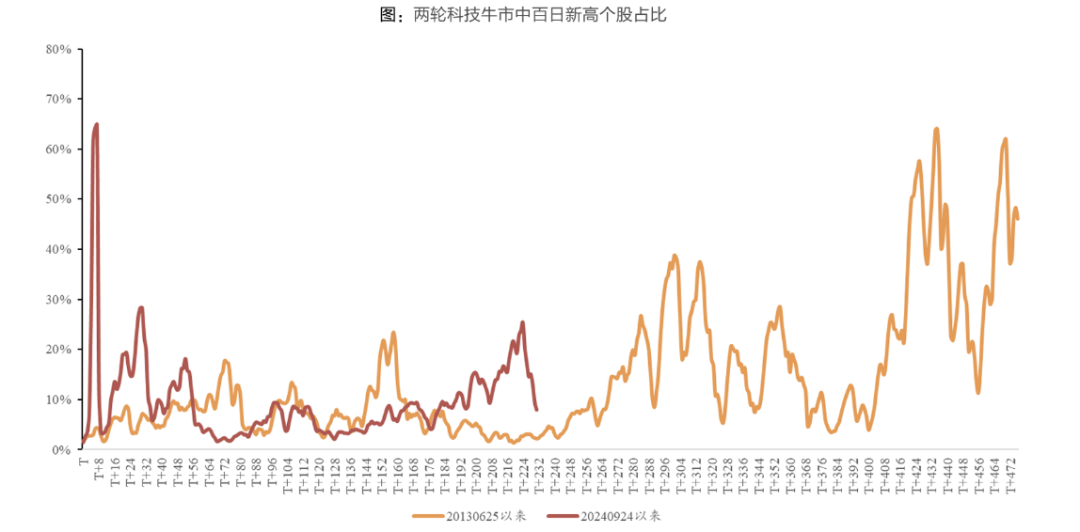 2013-2015 年,移动互联网从0到1推动一轮科技牛市;2024年9月24日,政策与AI共振,新一轮科技牛市启动。本轮行情在2024年10月初一度快速冲高至65%随后回落,近期阶段性高点为25%,与上一轮64%的峰值相比仍有较大差距,表明当前行情或仍停留在“龙头领涨”阶段,赚钱效应尚未全面扩散。