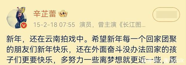 辛芷蕾摘取第82届威尼斯国际电影节影后殊荣,不仅引发各界关注,网上讨论也十分热烈。有网友指出,其实辛芷蕾能有今天的成绩,早就有迹可循。 关于辛芷蕾的成功,究竟有什么痕迹可循? 网友翻出了辛芷蕾10年前写的一段博文: 新年,还在云南拍戏中。希望新年每一个回家团聚的朋友们新年快乐,还在外面奋斗没办法回家的孩子们更要快乐,多努力一些离梦想就更近一些,愿每一个有梦的你都梦想成真!