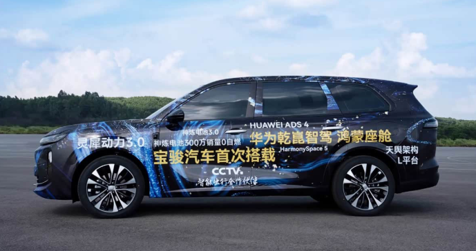 从图上可以看到,新车前脸采用当下流行的贯穿式灯组设计,车身侧面写有灵犀动力 3.0、神炼电池 3.0、天舆架构 L 平台等字样,这也是宝骏汽车首次搭载华为乾崑智驾、鸿蒙座舱。